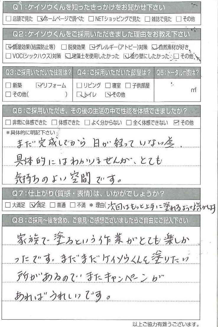 お客様の声(口コミ・評判)ご意見・ご感想「家族で塗るという作業がとても楽しかった!!」漆喰珪藻土自然素材系塗り壁材ケイソウくんでDIY簡単リフォーム施工事例