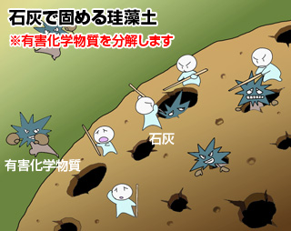 珪藻土を漆喰の原料「石灰」で硬化させた場合、石灰に含まれるアルカリによってホルムアルデヒドなどの有害化学物質は無害な物質に分解されます。