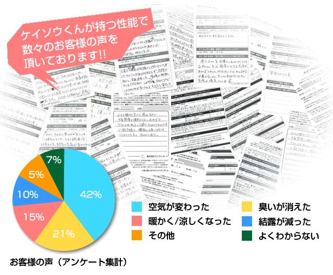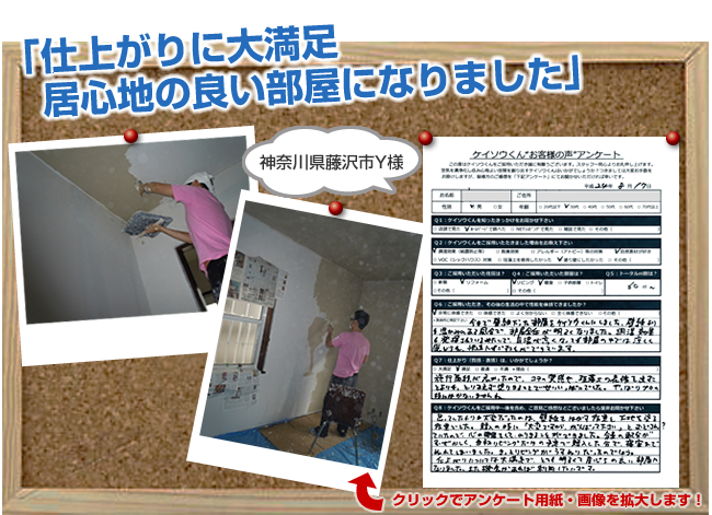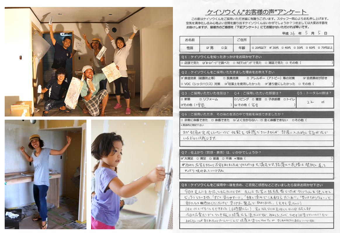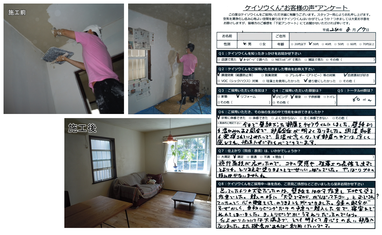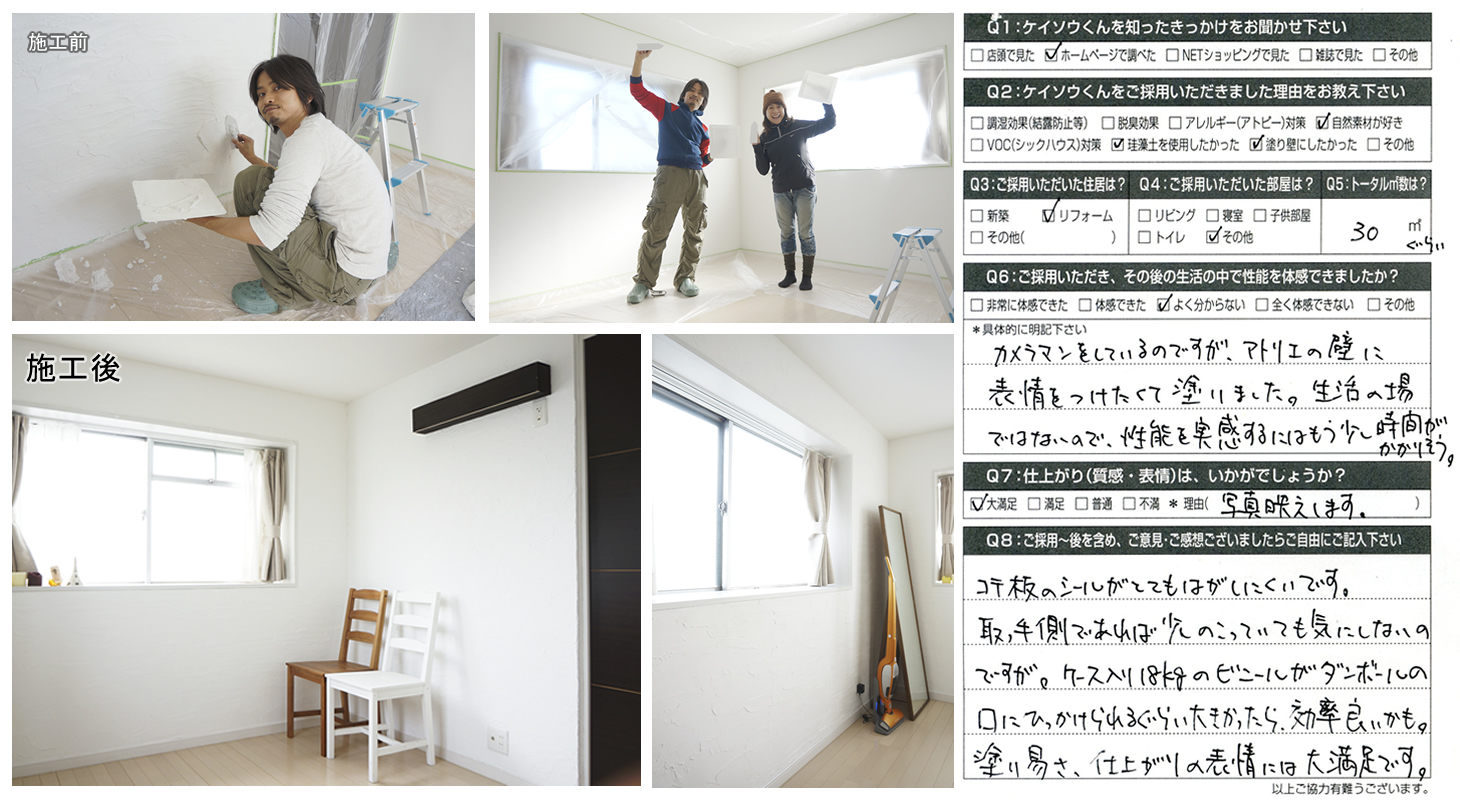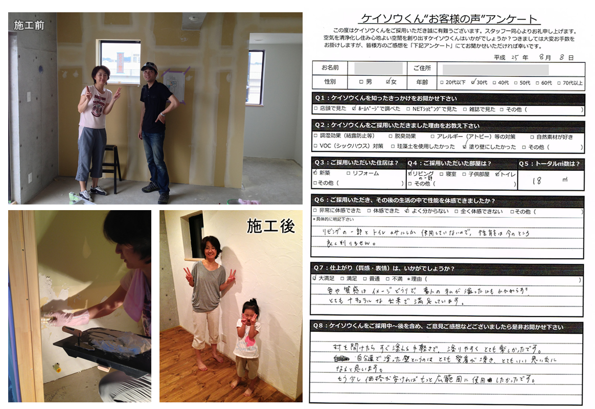 株式会社ワンウィルでは、「ケイソウくん」で塗り壁や壁紙を施工して頂いたお客様に対してアンケートをお願いしております。それは、「お客様のお悩みは解消したか?」「製品や施工技術に改良点はないか?」など、お客様の率直なご意見を伺うことが何よりも大切だと考えているからです。現在は80%以上のお客様に「満足」とご回答頂いておりますが「100%」全てのお客様にご満足いただけるように取り組んでまいります。
