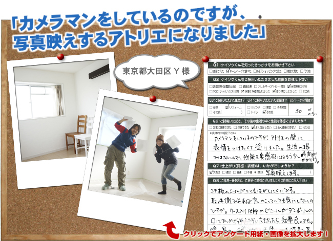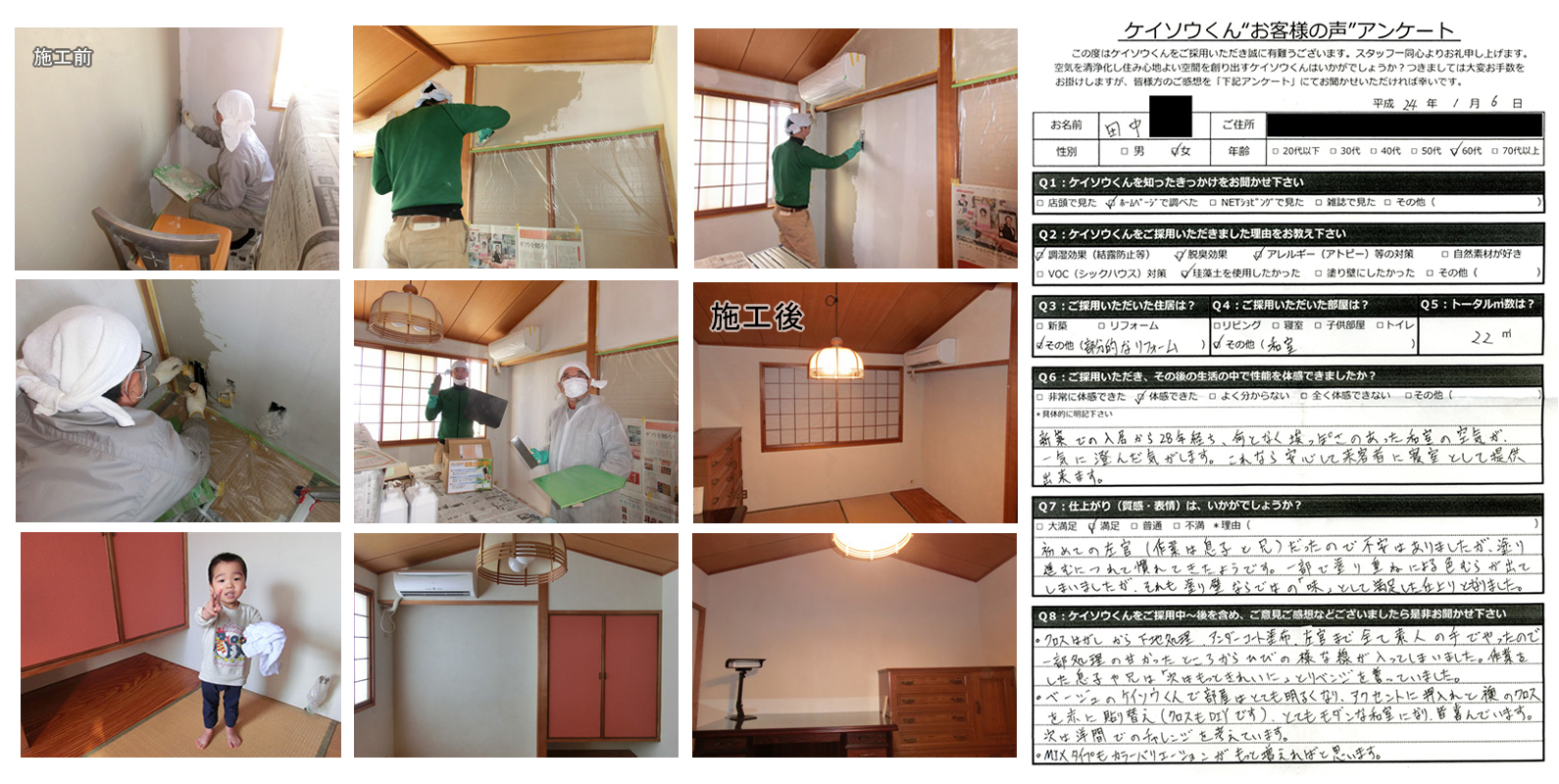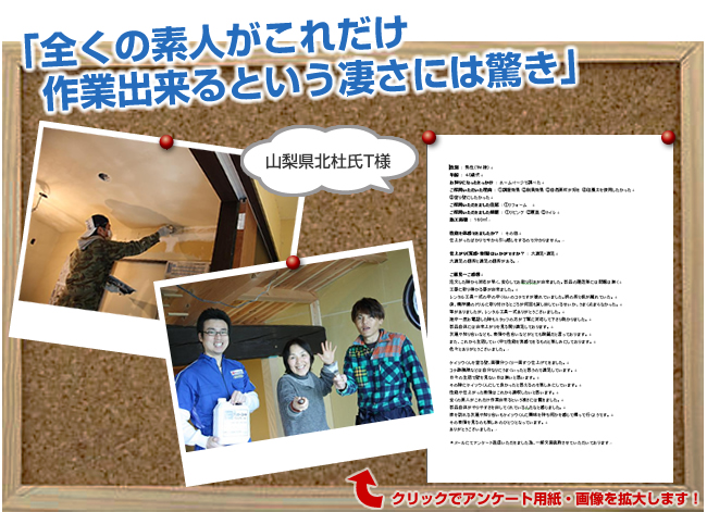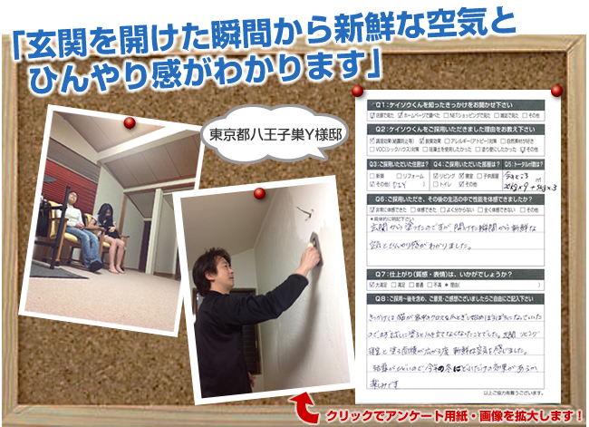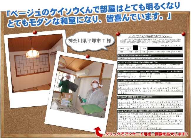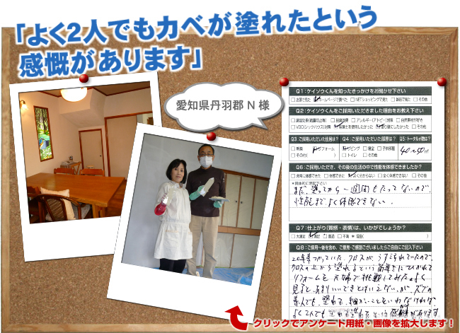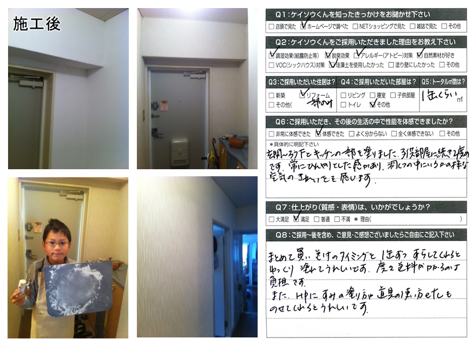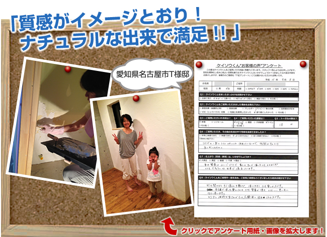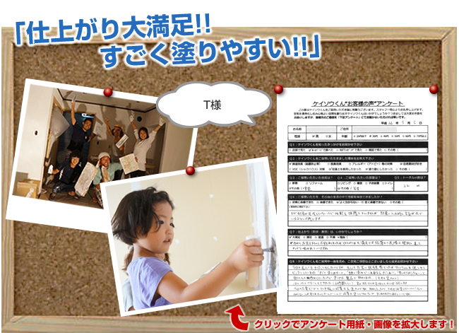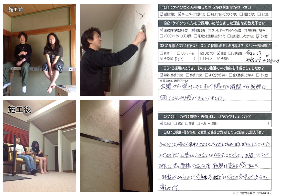 株式会社ワンウィルでは、「ケイソウくん」で塗り壁や壁紙を施工して頂いたお客様に対してアンケートをお願いしております。それは、「お客様のお悩みは解消したか?」「製品や施工技術に改良点はないか?」など、お客様の率直なご意見を伺うことが何よりも大切だと考えているからです。現在は80%以上のお客様に「満足」とご回答頂いておりますが「100%」全てのお客様にご満足いただけるように取り組んでまいります。
