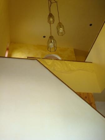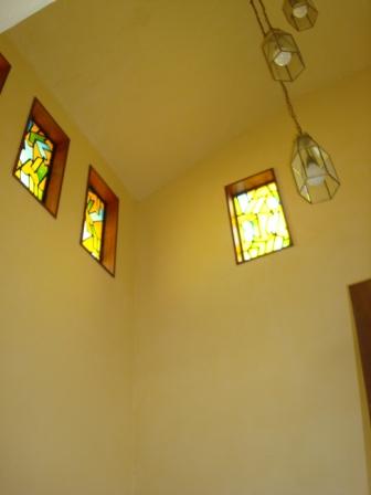 吹き抜け上部にあるステンドグラス、そして天井から吊るされたランプシェードとの