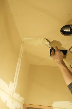 その石膏ボードのつなぎ目を「パテ材」を使用し補強施工を行っています。