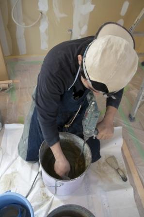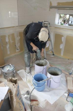 材料をバケツと撹拌機で練り上げ、壁に塗っていきます。