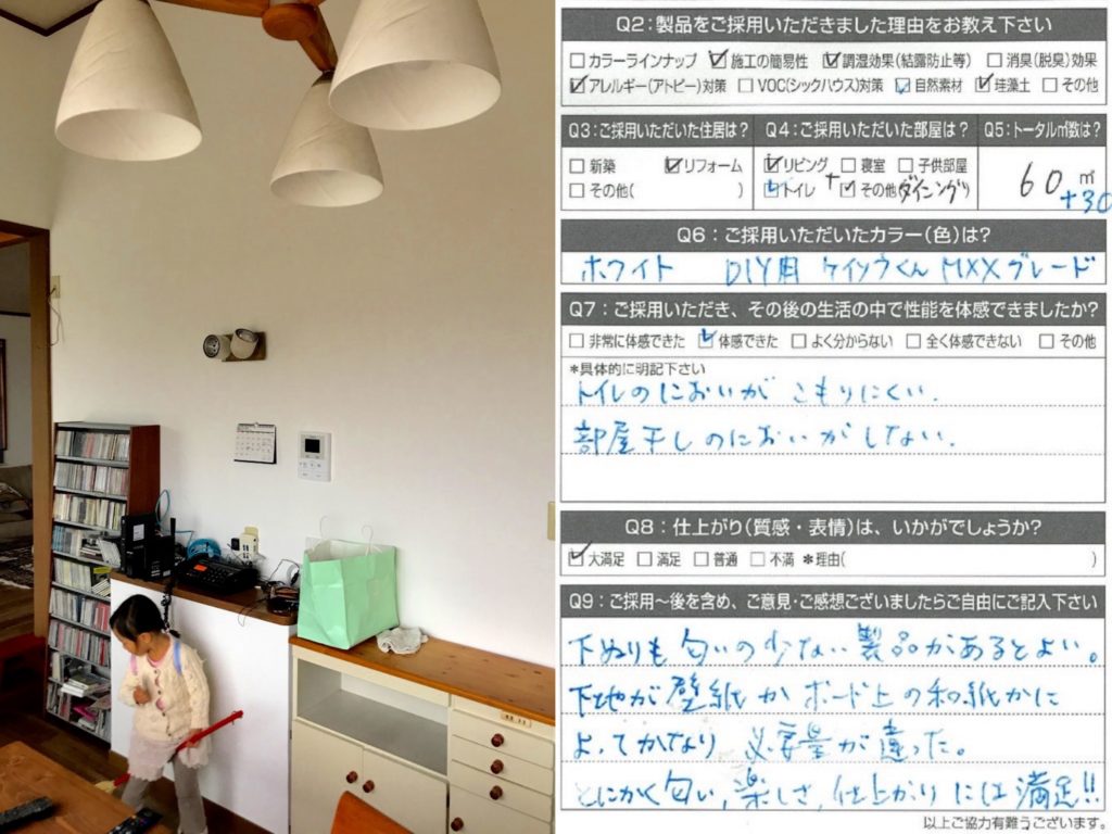 先ずは、今回の施工大変お疲れ様でした。トータル的に「とにかく匂い・楽しさ・仕上がりには満足!!」との声、そして具体的に「トイレのにおいがこもりにくい。部屋干しのにおいがしない。」とのご意見いただき大変嬉しく思います。