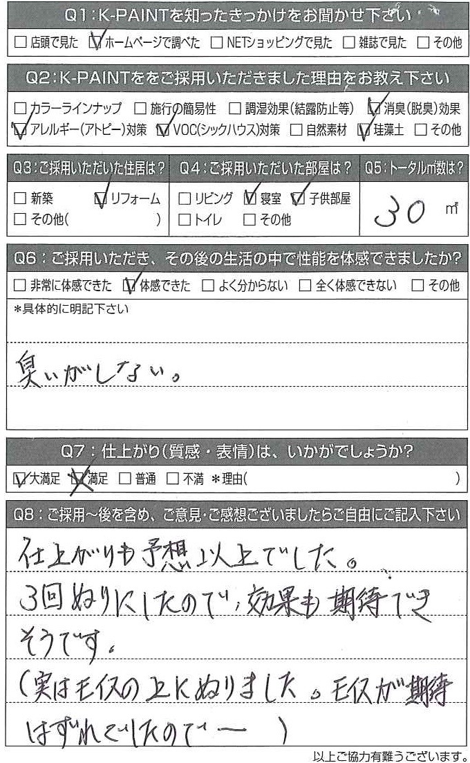 この度は珪藻土塗料ペイントタイプ『K-PAINT』をご採用いただき、また「ご意見・ご感想の声(口コミ・評判)・施工画像」をご送付いただき誠に有難うございます。スタッフ一同心よりお礼申し上げます。