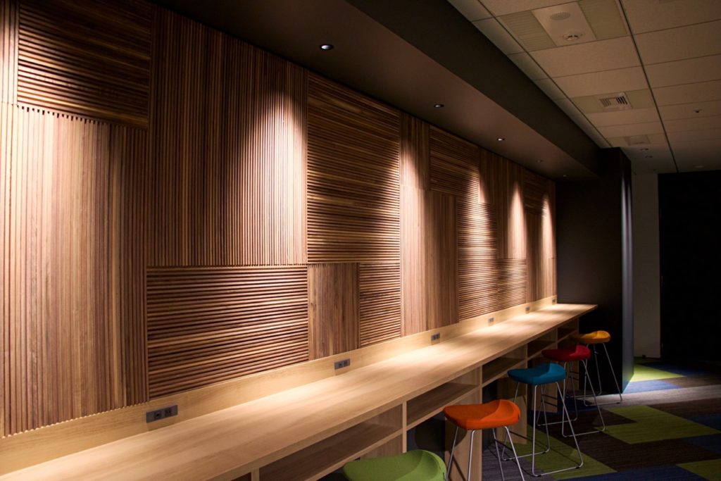 木製ウッドパネルをカウンター前壁面ウッドブリック施工例【某設計事務所オフィス&ミーティングルーム】